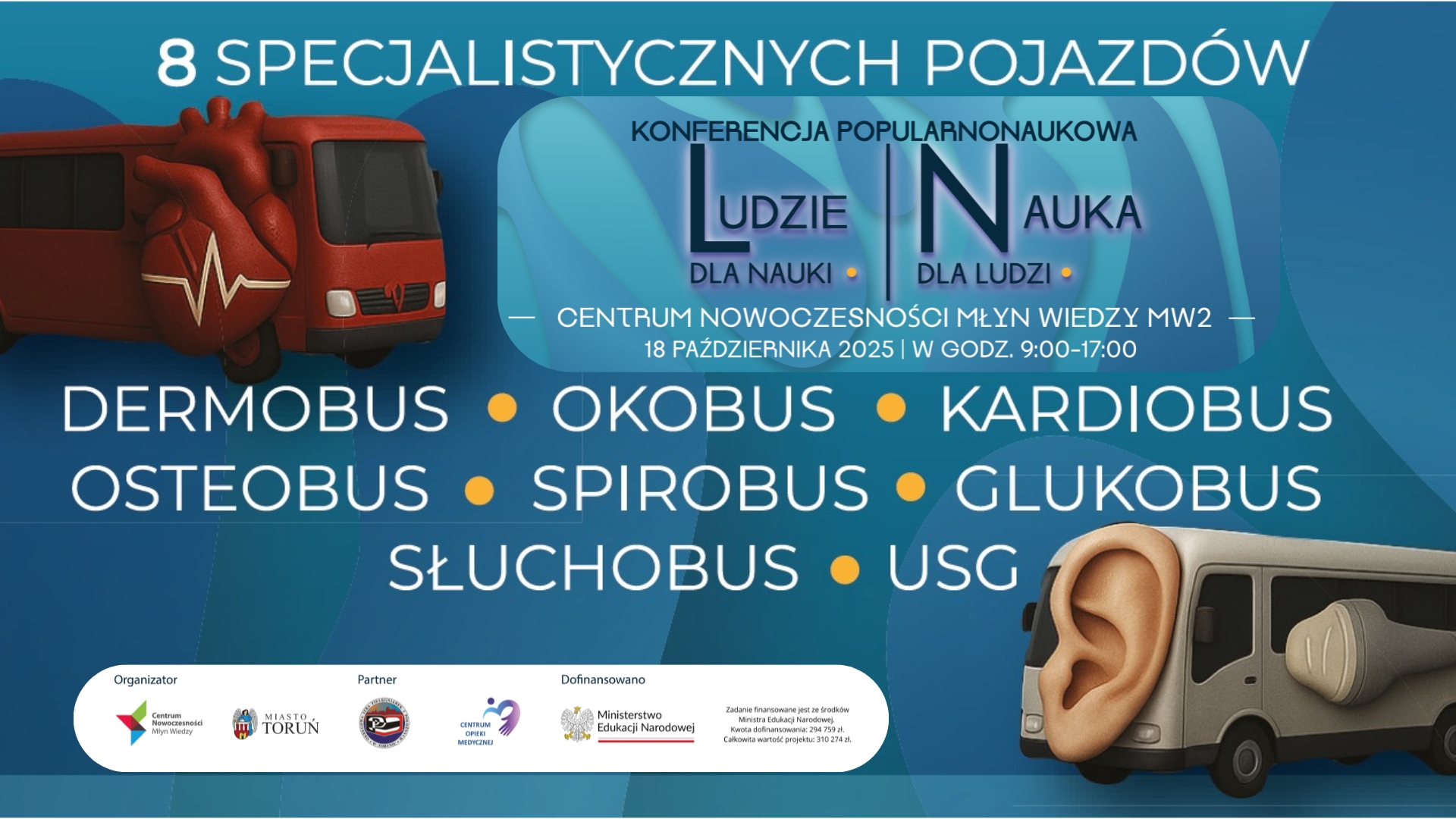 18 października w Centrum Nowoczesności Młyn Wiedzy odbędzie się konferencja popularnonaukowa „Ludzie dla Nauki, Nauka dla Ludzi”. W jej trakcie odbędą się bezpłatne badania, wykłady i panele dyskusyjne z naukowcami z całej Polski oraz wystawa posterowa „Odkrywcy”. W trakcie konferencji będzie można skorzystać z bezpłatnych badań diagnostycznych prowadzonych w ośmiu specjalistycznych pojazdach medycznych w strefie otwartego „Miasteczka Diagnostycznego”. Będzie można przebadać się w dermobusie, okobusie, kardiobusie, osteobusie, […]